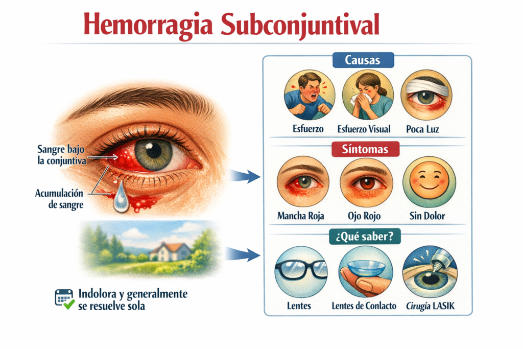 La **hemorragia subconjuntival** es la acumulación de sangre debajo de la conjuntiva, la capa transparente que cubre la parte blanca del ojo. Ocurre cuando un pequeño vaso sanguíneo se rompe, formando una mancha roja intensa que suele verse más alarmante de lo que realmente es. Generalmente no causa dolor ni afecta la visión, y tiende a resolverse por sí sola en pocos días.