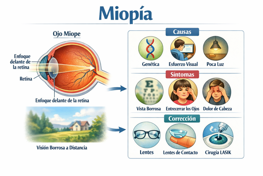 La **miopía** es un error refractivo en el que los objetos lejanos se ven borrosos porque la imagen se enfoca **delante de la retina** en lugar de directamente sobre ella. Esto ocurre cuando el ojo es más largo de lo normal o la córnea tiene demasiada curvatura. Aunque la visión cercana suele mantenerse clara, la dificultad para ver de lejos puede afectar actividades como conducir o reconocer rostros, por lo que requiere corrección con lentes, lentes de contacto o cirugía refractiva.