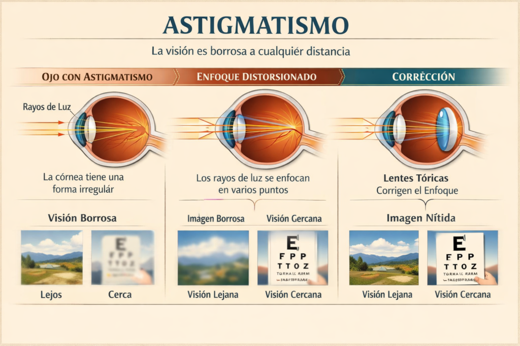 El **astigmatismo** es un error refractivo en el que la **córnea o el cristalino tienen una curvatura irregular**, lo que impide que la luz se enfoque en un solo punto de la retina. Esta irregularidad provoca **visión borrosa o distorsionada** tanto de lejos como de cerca, y puede acompañarse de fatiga visual o dolores de cabeza. Es una condición común y suele corregirse fácilmente con gafas, lentes de contacto o procedimientos refractivos.