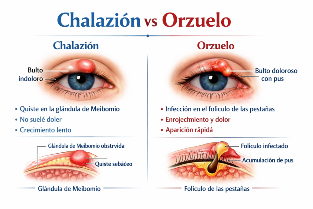El **chalazión** y el **orzuelo** son dos bultos comunes del párpado, pero con orígenes distintos: el **chalazión** es una inflamación no infecciosa causada por la obstrucción de una glándula de Meibomio, generalmente **indoloro y de evolución lenta**, mientras que el **orzuelo** es una **infección aguda** de una glándula o folículo piloso, que suele presentarse como un bulto **rojo, doloroso y sensible al tacto**. Ambos pueden generar molestia y hinchazón, pero requieren enfoques diferentes para su manejo.